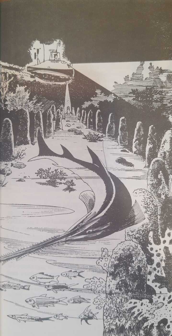 Você está vestindo uma indumentária especial que o protegerá da imensa pressão, se resolver caminhar pelo fundo do mar. Pode soltar-se do cabo se quiser, pois o “Pesquisador” é autopropulsor. Encontra-se agora num outro mundo.